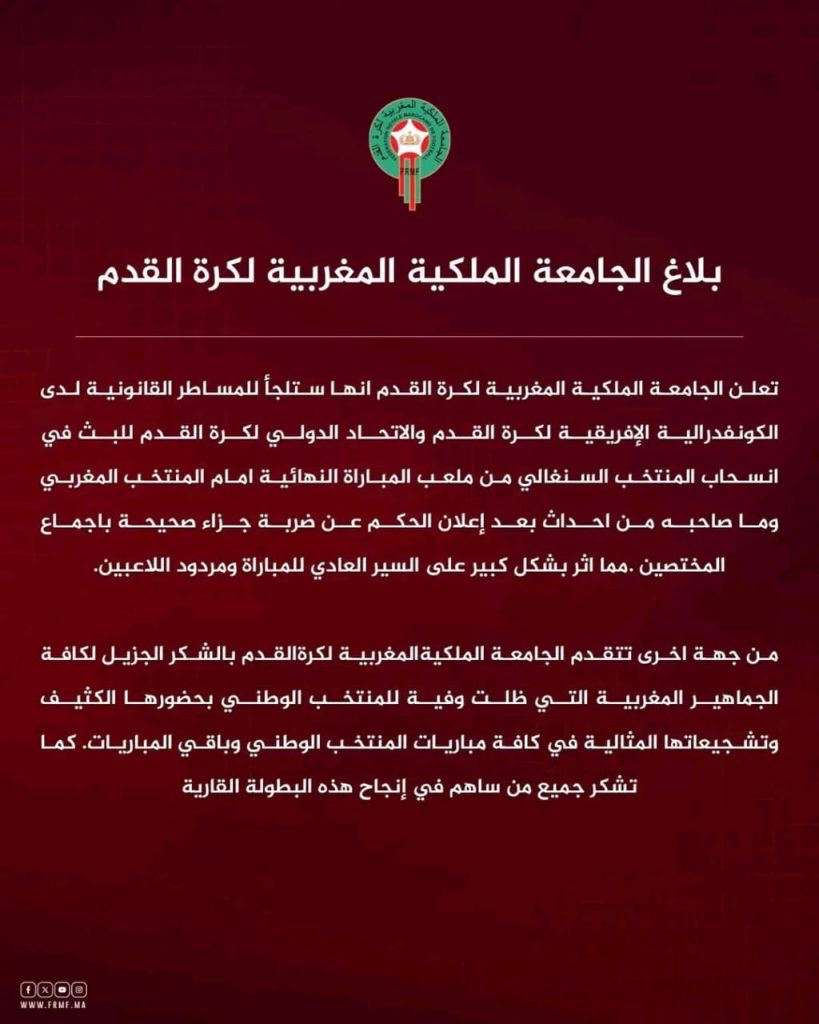 أعلنت الجامعة الملكية المغربية لكرة القدم انها ستلجأ للمساطر القانونية لدى الكونفدرالية الإفريقية لكرة القدم والاتحاد الدولي لكرة القدم للبث في انسحاب المنتخب السنغالي من ملعب المباراة النهائية امام المنتخب المغربي وما صاحبه من احداث بعد إعلان الحكم عن ضربة جزاء صحيحة باجماع المختصين مما اثر بشكل كبير على السير العادي للمباراة ومردود اللاعبين.