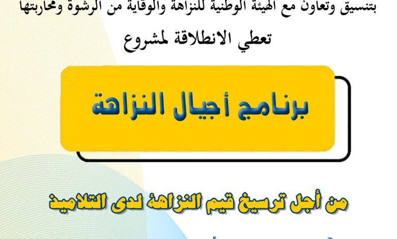 ويهدف هذا البرنامج التربوي إلى ترسيخ قيم النزاهة والشفافية والمواطنة لدى التلاميذ، وتعزيز دور المؤسسة التعليمية في التربية على السلوك المدني ومحاربة مظاهر الفساد، انسجاما مع التوجهات الوطنية الرامية إلى نشر ثقافة النزاهة داخل المجتمع.