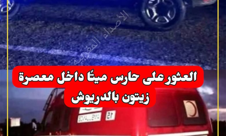 اهتزت منطقة معمران التابعة لجماعة بني مرغنين بإقليم الدريوش، مساء الأربعاء 21 يناير الجاري، على وقع العثور على حارس ليلي جثةً هامدة داخل معصرة للزيتون كان يشتغل بها منذ عدة سنوات، وينحدر من منطقة ابن الطيب، وذلك في ظروف غامضة.