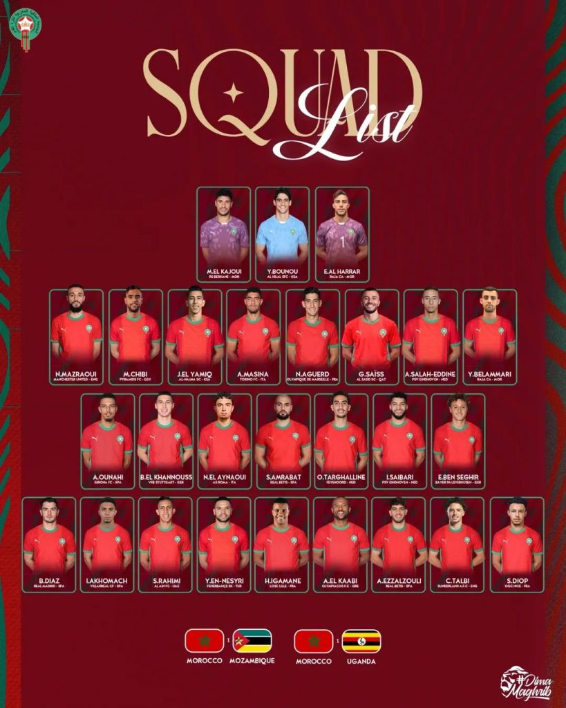 وفيما يلي لائحة المنتخب المغربي:ياسين بونو – منير المحمدي – المهدي الحرار – نصير مزراوي – محمد الشيبي – جواد الياميق – آدم ماسينا – نايف أكرد – رومان سايس – أنس صلاح الدين – يوسف بلعمري – عز الدين أوناحي – بلال الخنوس – نايل العيناوي – سفيان أمرابط – أسامة تيرغالين – اسماعيل الصيباري – إلياس بن الصغير – ابراهيم دياز – إلياس أخوماش – سفيان رحيمي – يوسف النصيري – حمزة ايغمان – أيوب الكعبي – عبد الصمد الزلزولي – شمس الدين الطالبي – سفيان ديوب