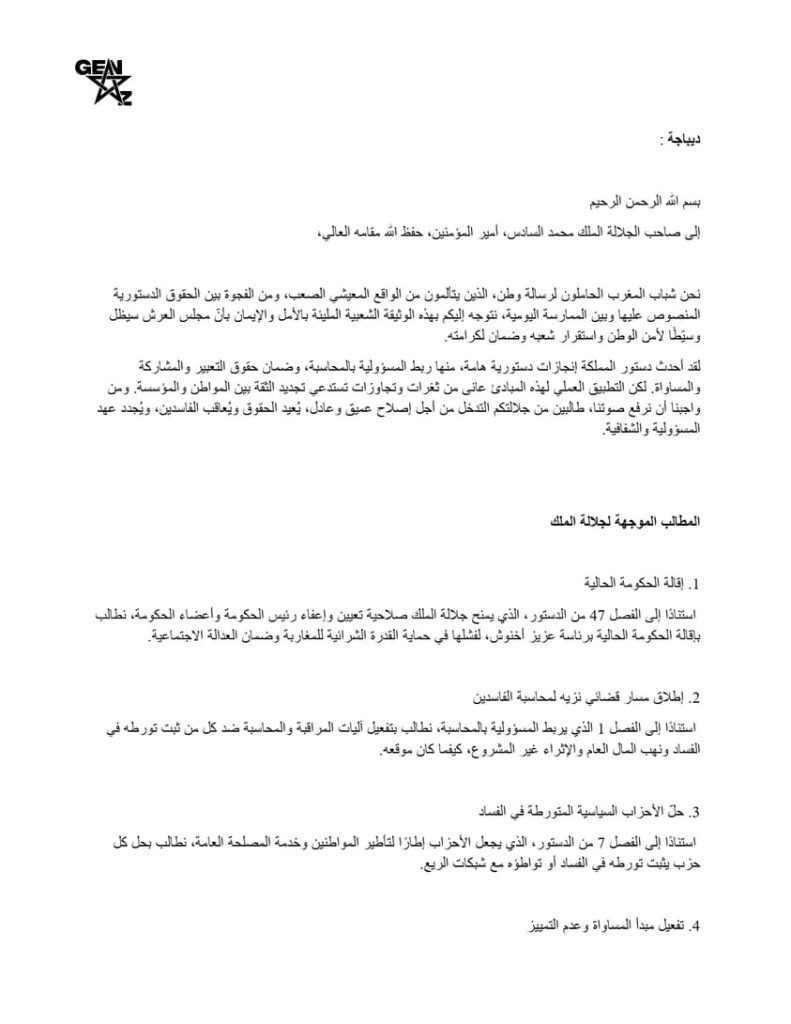 كما اقترحت الوثيقة عقد جلسة وطنية علنية للمساءلة برئاسة الملك، تعرض فيها ملفات الفساد وسوء التدبير الحكومي أمام الرأي العام، معتبرين أن الهدف ليس الانتقام بل إرساء سابقة تاريخية تؤكد أن المغرب دخل مرحلة جديدة من ربط المسؤولية بالمحاسبة الفعلية.