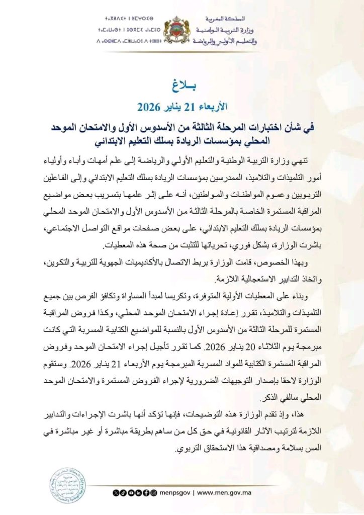 المديريات الإقليمية للوزارة بعدد من المدن، من بينها سلا، أعلنت عبر إشعارات استعجالية موجهة إلى مديرات ومديري المؤسسات التعليمية، تأجيل امتحان مادة الرياضيات إلى أجل غير مسمى، بعد تبرير القرار بـتسريب مواضيع الامتحان.