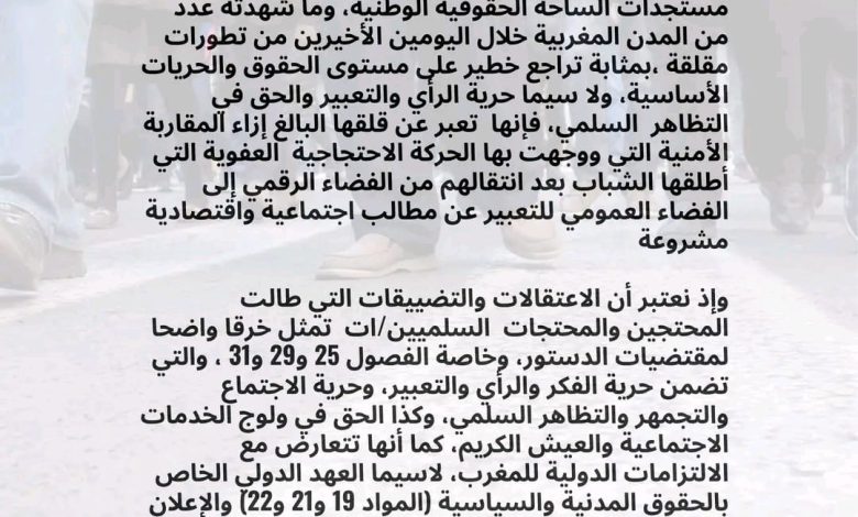 كما نبهت الجمعية إلى أن استمرار الانتهاكات من شأنه تأجيج الأوضاع الداخلية وتعريض المغرب للمساءلة أمام آليات الأمم المتحدة لحقوق الإنسان، داعية السلطات إلى الالتزام بالدستور والمواثيق الدولية، والعمل على الاستجابة للمطالب في إطار يعزز دولة الحق والقانون ويكرس الحقوق والحريات.