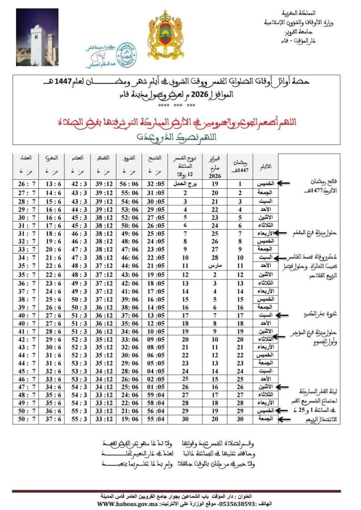 حصة أوقات الصلاة لشهر رمضان لعام 1447 للهجرة لمدينة فاس