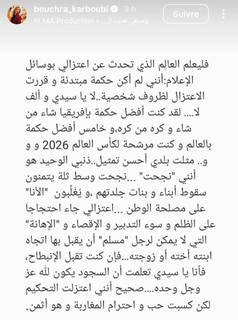 وأكدت المعنية، عبر تدوينة نشرتها في خاصية “ستوري” بحسابها الرسمي على موقع إنستغرام، أن قرار الاعتزال لم يكن نتيجة ظروف شخصية أو ضعف مهني كما روج له بل جاء عن قناعة واحتجاجا على ما وصفته بـالظلم وسوء التدبير والإقصاء والإهانة