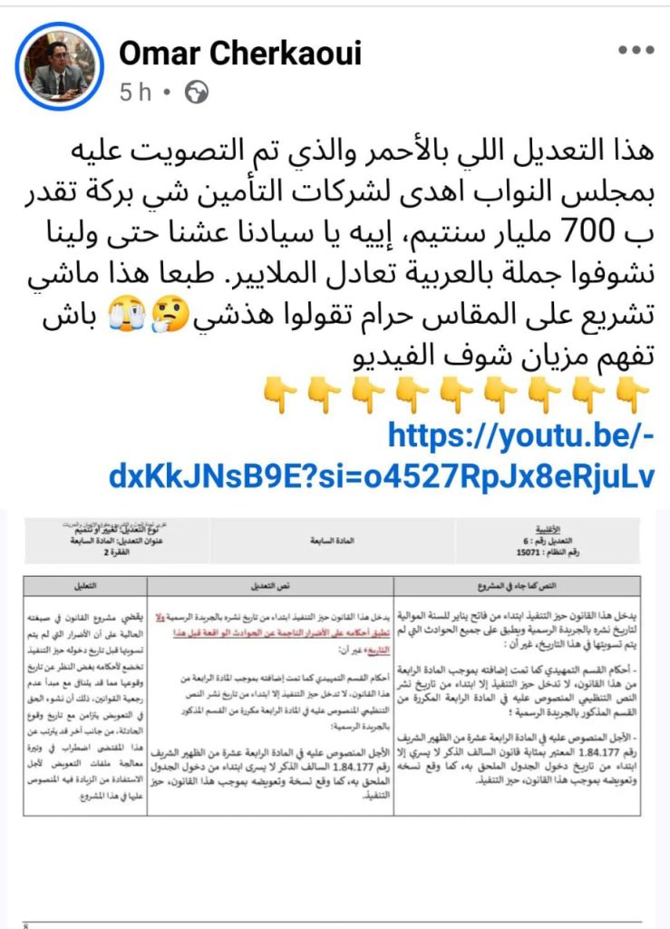 تحذير الشرقاوي جاء واضحا هذا التعديل الذي لم يقدم باسم الأغلبية سيتيح لشركات التأمين التهرب من أداء تعويضات عن آلاف الحوادث السابقة، بما يعادل 700 مليار سنتيم، وفق تقديره. ويشير الشرقاوي إلى أن النص الأصلي لم يكن يتضمن هذه العبارة الخطيرة، إذ كان ينص على:“يطبق على جميع الحوادث التي لم يتم تسويتها في هذا التاريخ.