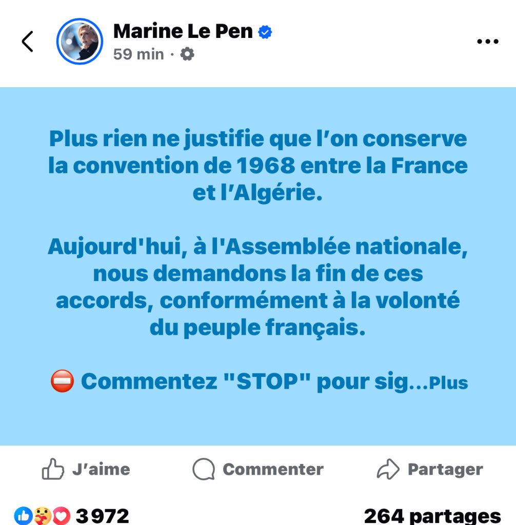 دعت زعيمة حزب التجمع الوطني الفرنسي مارين لوبان البرلمان الفرنسي إلى وقف العمل بجميع الاتفاقيات الموقعة مع النظام الجزائري وفي مقدمتها اتفاقية عام 1968 التي تنظم العلاقات بين البلدين في عدد من المجالات