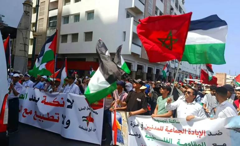 شهد شارع محمد الخامس بالرباط صباح اليوم الأحد مظاهرة حاشدة منددة بالتطبيع، وناصرة للشعب الفلسطيني.