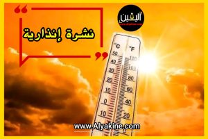 كما يرتقب، حسب المصدر نفسه، تسجيل موجة حر من يوم الأربعاء إلى يوم الجمعة المقبل بكل من إنزكان، وايت ملول، وأكادير إداوتنان، وشتوكة ايت باها، وسيدي إفني، وطانطان، والعيون، وطرفاية، وبوجدور، وأوسرد، ووادي الذهب بدرجة حراراة تتراوح ما بين 36 و40 درجة، وفي كل من الفقيه بنصالح، وأزيلال، وبني ملال، وسيدي بنور، وسطات، والحوز، وشيشاوة، وقلعة السراغنة، والصويرة ومراكش، والرحامنة، واسفي، واليوسفية، بدرجة حرارة تتراوح بين 34 و38 درجة.