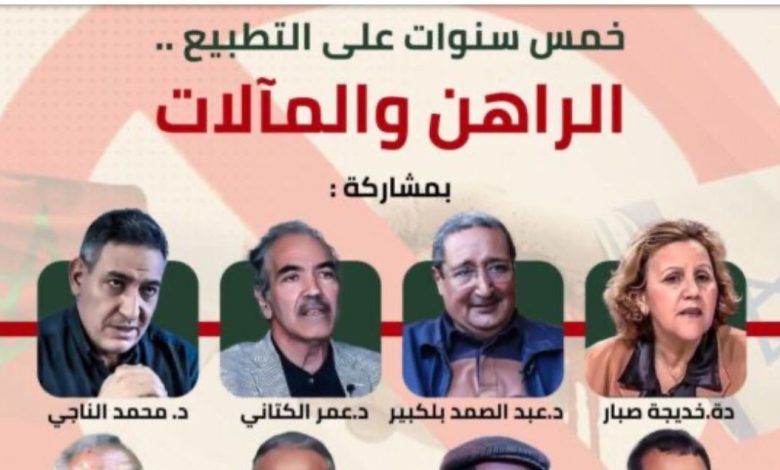 أعلنت مجموعة العمل الوطنية من أجل فلسطين عن تنظيم ندوة وطنية، يوم الخميس بالرباط، تحت عنوان «خمس سنوات على التطبيع: الراهن والمآلات»، وذلك بمناسبة مرور خمس سنوات على إعلان التطبيع بين المغرب وإسرائيل.